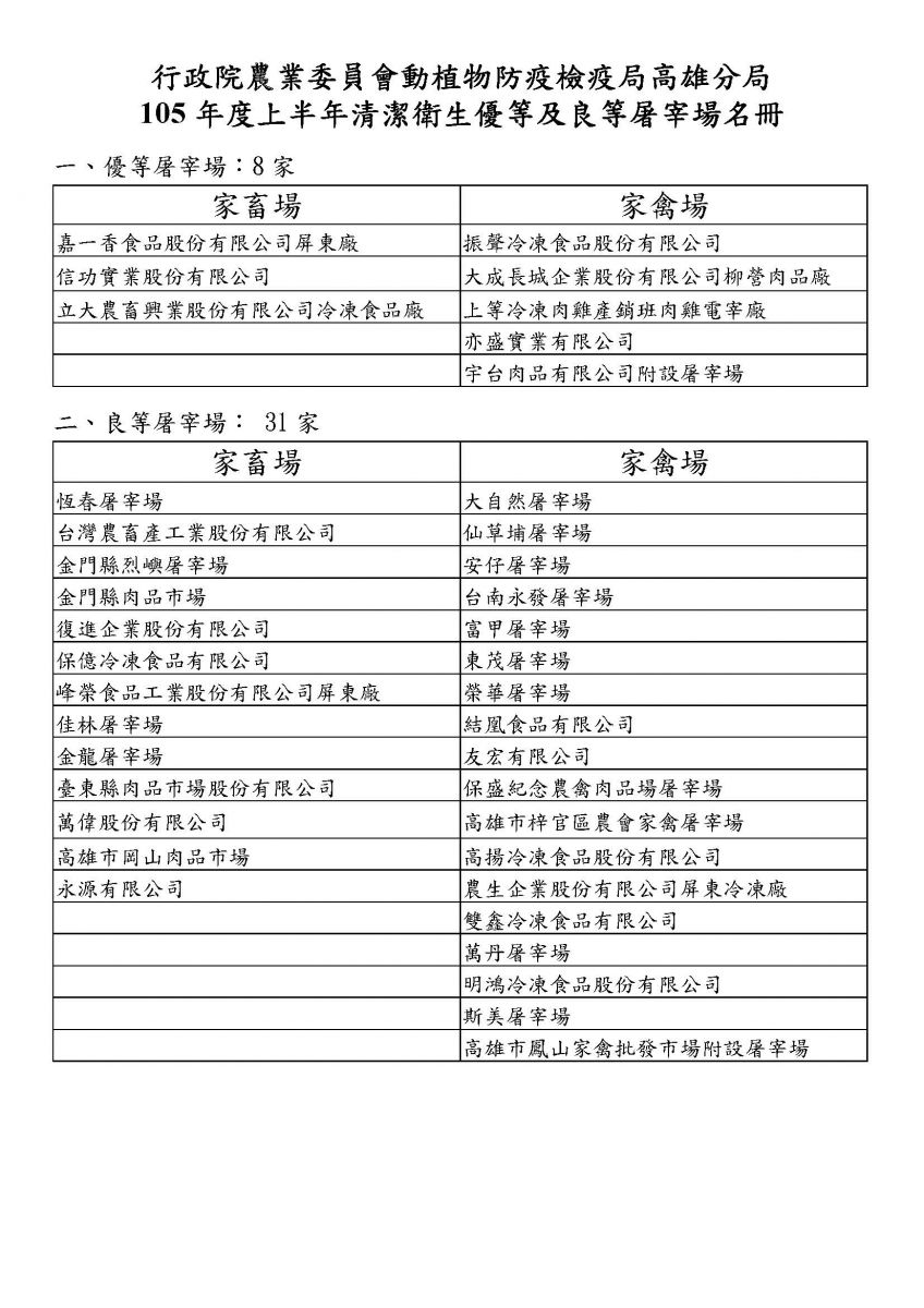 『105年度上半年清潔衛生優等及良等屠宰場名冊』獲得優等屠宰場的肯定!