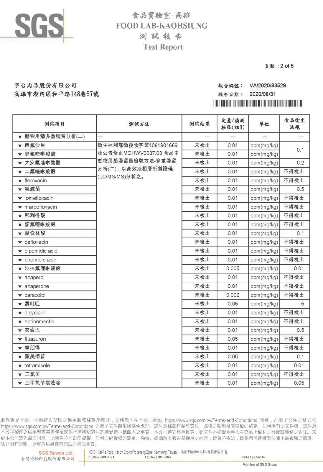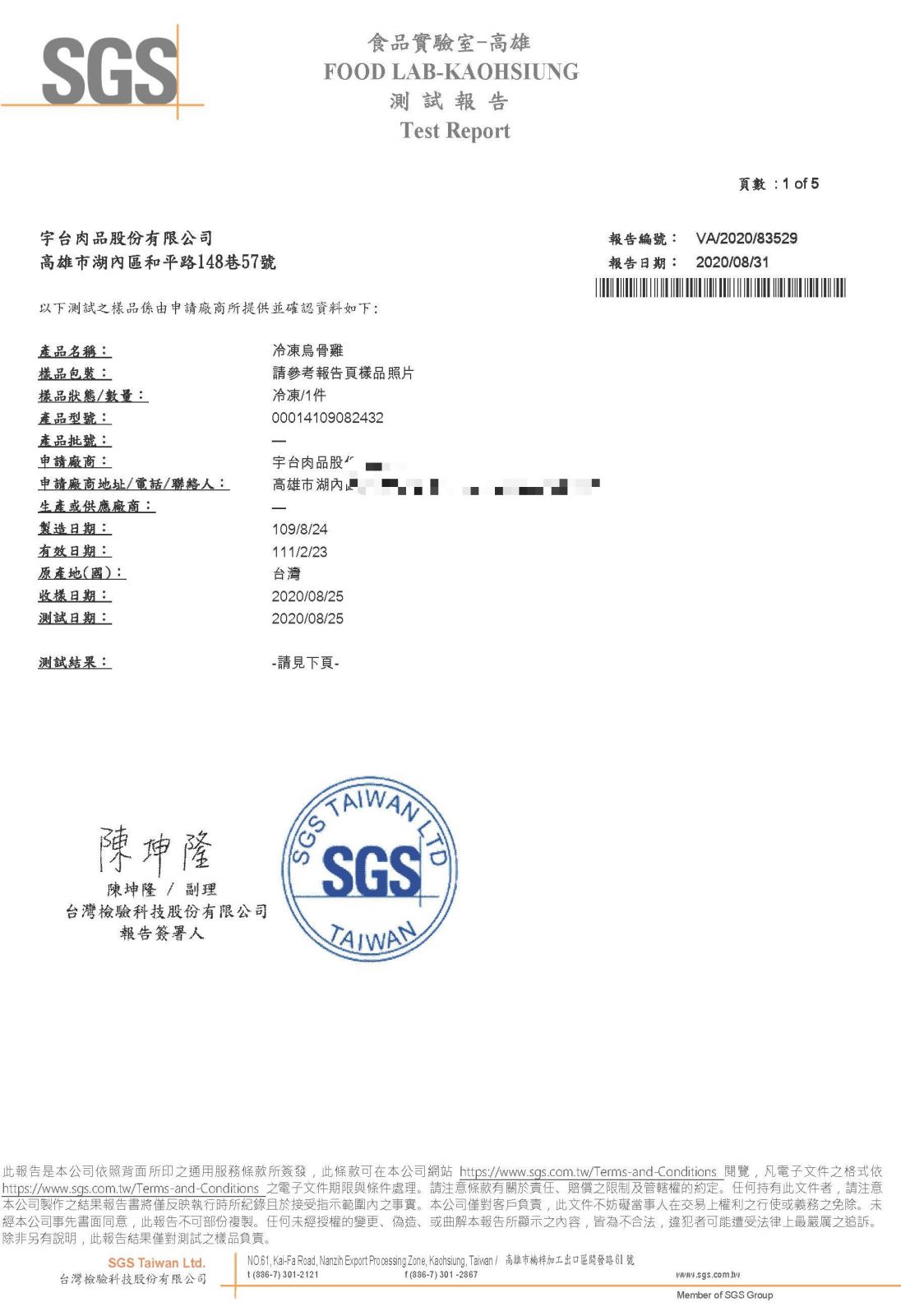 冷凍烏骨雞 藥物殘留未檢出    2020.08月SGS檢驗報告